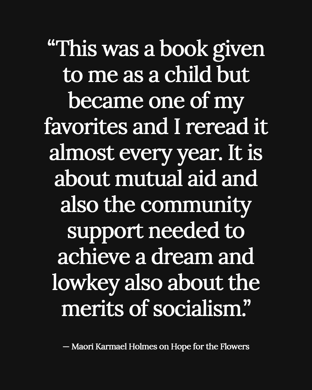 Curated by filmmaker, curator, and cultural worker Maori Karmael Holmes, this installment of Radical Roots draws from a lifelong engagement with Black art, history, and worldmaking. As the chief executive and artistic officer of BlackStar Projects, Holmes has helped shape a cultural home for artists and audiences imagining liberation across mediums and geographies. Her selection spans political theory, speculative fiction, visual culture, and childhood favorites—mapping a personal archive of texts that have shaped her radical imagination. From Hope for the Flowers to Unthinking Eurocentrism, these works illuminate the contours of her practice: rigorous, loving, and deeply attuned to both beauty and struggle.
