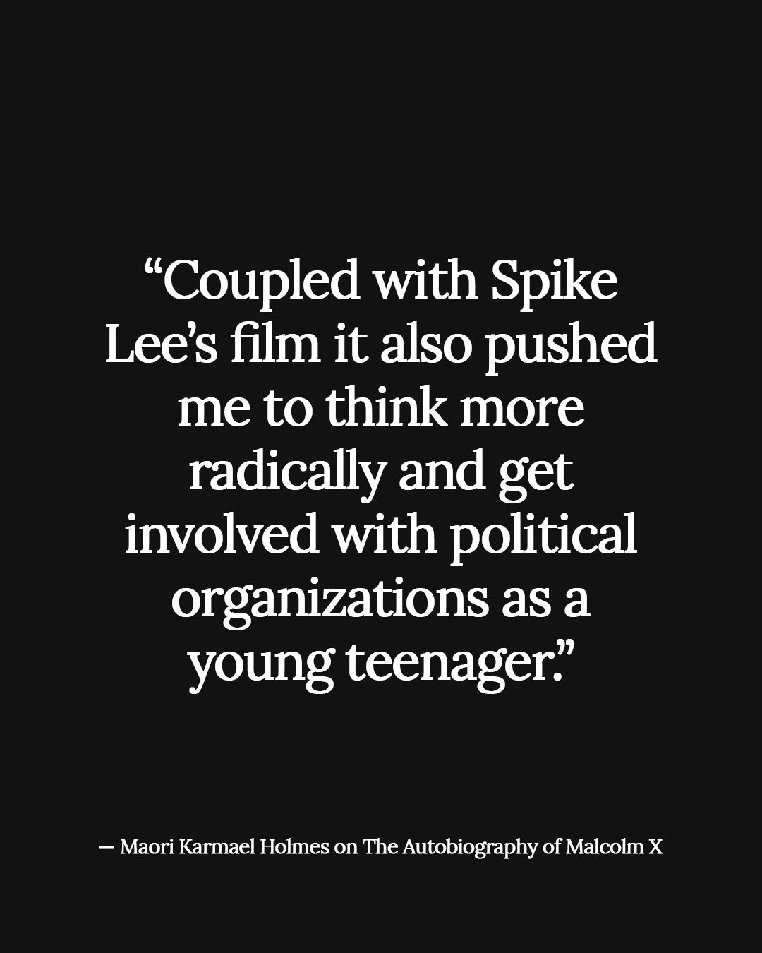 Purchase"Like so many folks, I read this book when I was around 12 and it opened up my brain and inspired me. Coupled with Spike Lee’s film it also pushed me to think more radically and get involved with political organizations as a young teenager."